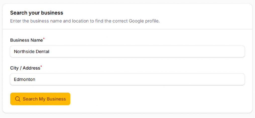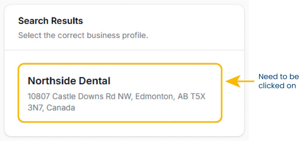 The Search: In this example, we enter “NorthSide Dental” and “Edmonton” into our business lookup tool.